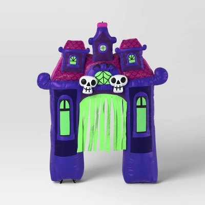 Impress the neighbors and passers-by with your Halloween decor using this Projection Airblown Archway Kaleidoscope Haunted House Halloween Inflatable Decoration from Hyde and EEK! Boutique™. This Halloween decoration features an inflatable haunted house in an archway design for a magnificent display. The house is decorated with skulls and creepy colors, such as purple and neon green, that bring out the festive charm of Halloween. It includes ten stakes and four tie-downs to securely attach the house to the ground.