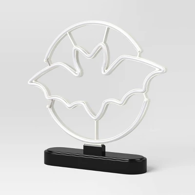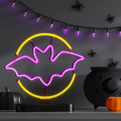 Impress all the trick-or-treaters on the scariest night of the year with the Lit Neon Moon and Bat Halloween Decorative Prop from Hyde and EEK! Boutique™. The decorative prop features a neon yellow moon with pink bat on the inside and a rectangular stable base. The prop also lights up with the included batteries to add an eerie glow to your display.