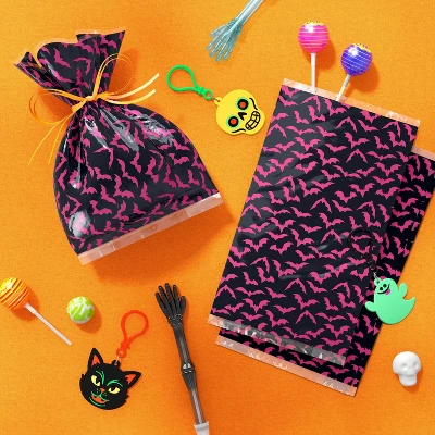 Delight your little ghouls and guests with these 12-Count Bat Cello Bag Party Favors from Hyde and EEK! Boutique™ This set includes 12 cello bags with twist ties, all adorned with a seamless print of pink bats popping from a black background, evoking an eerie delight. Stuff them with candy or small Halloween props and hand them out while hosting fall gatherings for kids or entertaining trick-or-treaters.