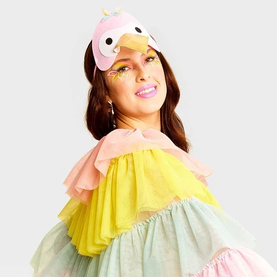 Be a colorful parrot this Halloween party with the Adult Parrot Halloween Costume Accessory Kit from Hyde and EEK! Boutique™. This pink costume accessories kit includes a tiered design cape with mesh detailing and a mask to help complete the look. Made of soft fabric, the pieces are comfortable and great to enjoy at Halloween or other themed parties.