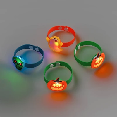 Delight trick-or-treaters or young party guests with these 4-Count LED Bracelet Party Favors from Hyde and EEK! Boutique™. Made of plastic, this pack contains four wearable bracelets with assorted Halloween-themed colors and designs — 2 in green with orange jack-o’-lanterns, 1 in yellow with a white ghost and 1 in blue with a green skull — all featuring an LED light-up design. The kids can wear them as glowing accessories or share them with friends for a night of festive fun.