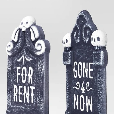 Add a ghostly touch to your Halloween decor with this 4-Pack 16.73-Inch Tombstones Halloween Decorative Prop from Hyde and EEK! Boutique™. Made from plastic, this decorative prop kit includes four brick-like tombstones with sculptural designs in black and white with different creepy text such as “See You Soon”, “RIP,” and more. Display them individually, as a pair, triplet or quartet anywhere indoors or outdoors, or combine them with other Halloween props for a festive display.