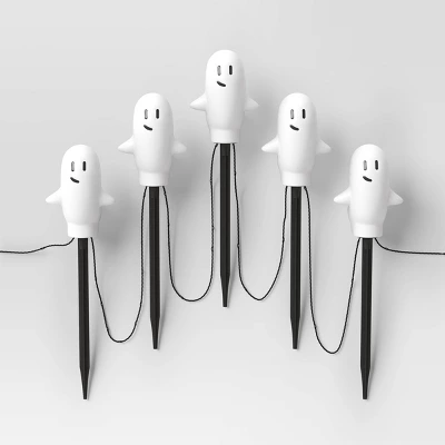 Bring a scary update to your Halloween decor with these 5-Count LED Ghost Pathway Lights with Chasing Light Effect and Timer from Hyde and EEK! Boutique™. These Halloween pathway lights showcase LED cool white ghosts designed with a chasing light effect and a timer to cast a scary-festive glow that completes your outdoor display. It includes black ground stakes for an easy and secure display. Place them along a walkway or in your yard to light up the night.