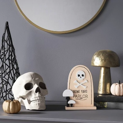 Scare your party guests with this Skull Halloween Decor Hyde and EEK! Boutique™. This ivory model of realistic human skull brings a creepy look wherever placed. This decorative skeleton prop is suitable for both indoor and outdoor use. You can place it on your mantel, desk, dining table, console or shelf for fun, eerie style.