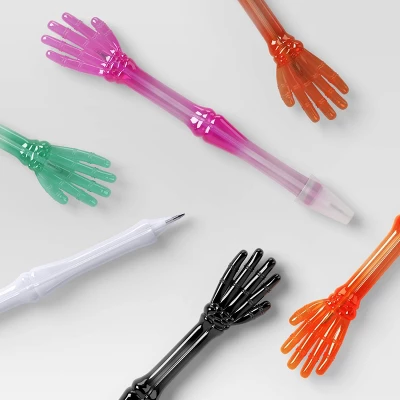 - 6 skeleton hand pens in red, green, orange, pink, black and bluish-white
