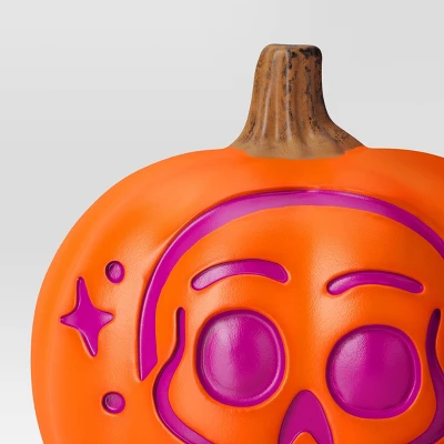 Add glowing ghoulish vibes to your seasonal decor with this 9-Inch Lit Pumpkin Skull Blow Mold and No Cutout Halloween Decorative Prop from Hyde and EEK! Boutique™. Made from polyethylene material, this decorative prop has a brown stem-topped orange pumpkin adorned with a bright pink skull, dots, and stars. This battery-powered pumpkin boasts a timer function for customizable display options. Set it anywhere in your house or a covered outdoor location to help welcome trick-or-treaters.
