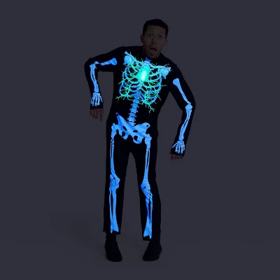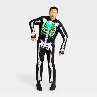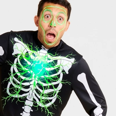 Take on Halloween night in classic style with this Light-Up Electric Bones Skeleton Costume Glows Under Blacklight from Hyde and EEK! Boutique™. Made from 100% polyester, this Halloween costume features a black jumpsuit with long sleeves, adorned with white-and-green bones that light up eerie green. Complete your look with green face makeup and black boots. Glows under blacklight.