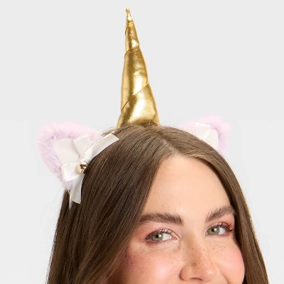 Give your Halloween costume a magical twist with this Halloween Unicorn Costume Headband from Hyde and EEK! Boutique™. Made from plastic and polyester, this unicorn costume headband is adorned with a gleaming gold-tone horn on the top, flanked by light pink unicorns ears with white fronts and white ribbon bows with golden bell accents . Pair it with any outfit for a quick and easy party-ready look, or go all out with a full unicorn costume for trick-or-treating with the kids.