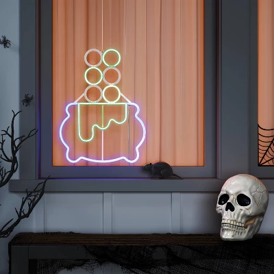 Captivate and enchant with this Brew Animated Faux Neon LED Sign Halloween Novelty Silhouette Lights Purple/Green from Hyde and EEK! Boutique™. Designed as a silhouette of a witch’s cauldron, this LED sign display features 304 green and purple bulbs synced to create the illusion of a magical, bubbling brew. This sign is suitable for both indoor and outdoor use, featuring a hanging ring and an electric plug-in power adapter.