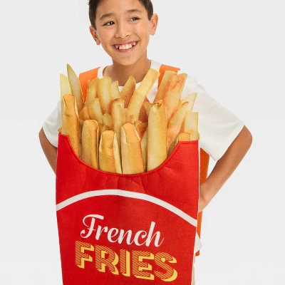 Bring your fast food love to the next Halloween party with the Kids + Adult French Fries Halloween Costume Sandwich Board from Hyde and EEK! Boutique™. Designed in the shape of a container of French fries, this costume comes complete with shoulder straps and the label “French Fries” for realistic appeal. This costume sandwich board is made with lightweight fabric for comfortable wear.