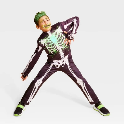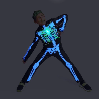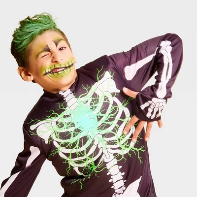 Your kid will have a glowing good time on Halloween night in this Kids’ Costumes Light-Up Electric Bones Skeleton Glows Under Blacklight from Hyde and EEK! Boutique™. This costume features a black and white polyester skeleton jumpsuit with green electric accents. The bones glow in the dark, and the center of the chest also lights up green with the help of three LR44 alkaline batteries (included) for extra fun. Also glows under blacklight.