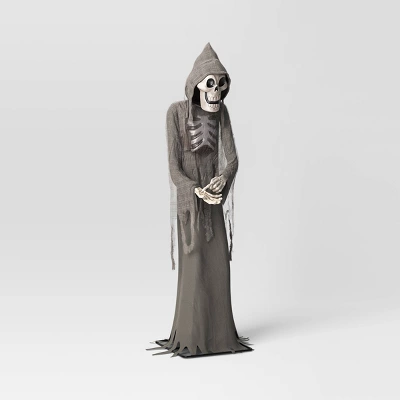 Create a shocking surprise for trick-or-treaters with the 8-Foot Light Up “Bruce” Reaper Outdoor Halloween Decorative Prop from Hyde and EEK! Boutique™. This tall reaper decorative prop has a skull face and comes wearing a black gown and hood for creepy style. The prop has glowing eyes, rib cage and hands for scary appeal. Made with plastic, this light-up decorative prop is great for an outdoor space.
